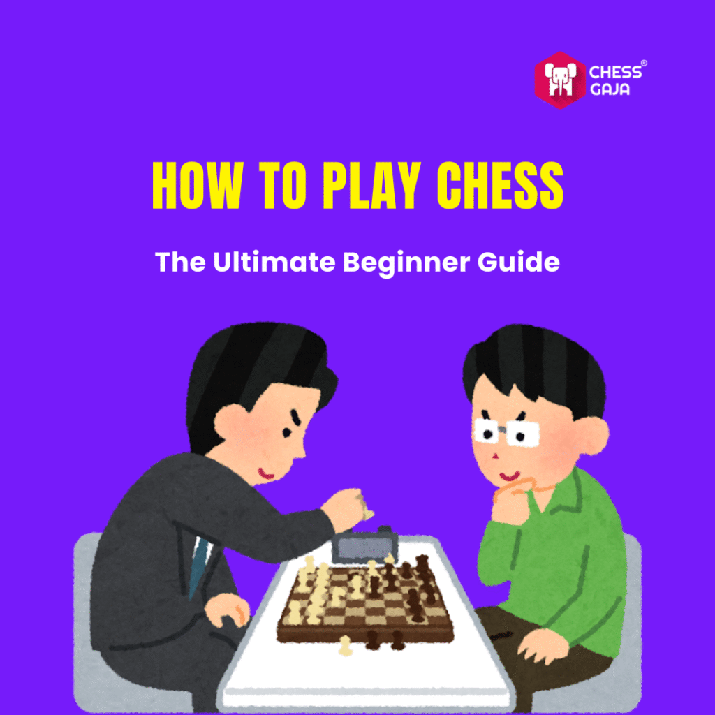 Two people sit at a table playing chess, with one making a move and the other watching. Text above reads "How to Play Chess: The Ultimate Beginner Guide" with the Chess Gaja logo.