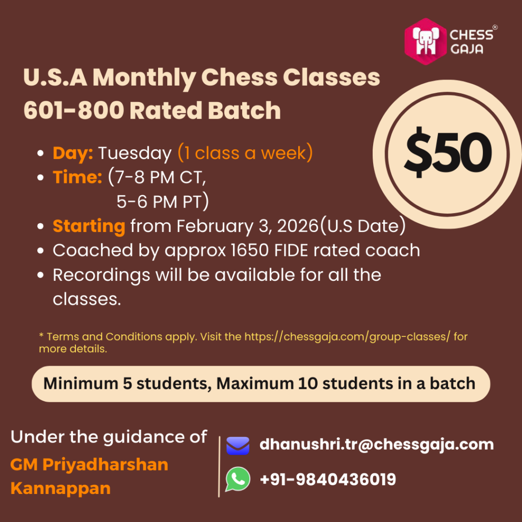 Informational flyer for U.S.A monthly chess classes (601-800 rated), $50, starting Feb 3, 2026, one class per week, with GM Priyadharshan Kannappan. Contact details provided.